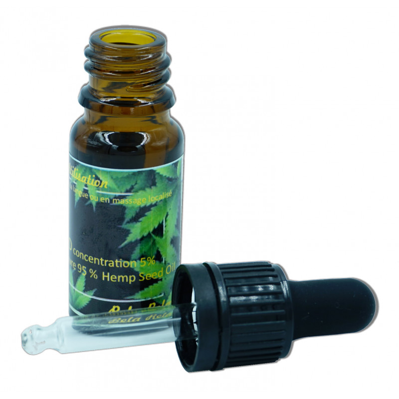 Flacon de 10 ml d'huile de chanvre vierge avec une concentration de 5 % CBD cannabidiol